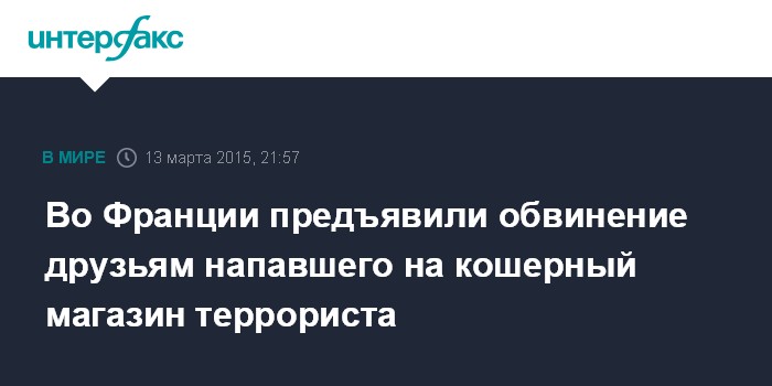 Москва. 13 марта. INTERFAX.RU - Прокуратура Франции предъявила обвинения в терроризме двум друзьям исламиста Амеди Кулибали, совершившего в начале января нападение на супермаркет кошерной пищи на окраине Парижа, сообщают в пятницу западные СМИ.
