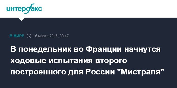 Москва. 16 марта. INTERFAX.RU - Десантный вертолетоносный корабль-док (ДВКД) "Севастополь" типа "Мистраль" - второй из числа построенных на верфях компании STX France в Сен-Назере для ВМФ России - должен по плану в понедельник впервые выйти в море на испытания, сообщили "Интерфаксу" в кораблестроительной отрасли.