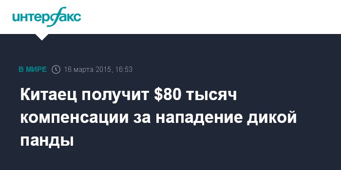 Москва. 16 марта. INTERFAX.RU - Житель КНР, пострадавший после нападения дикой панды, отсудил около $83 тысяч у местных властей в качестве компенсации, сообщает британское издание The Daily Telegraph.