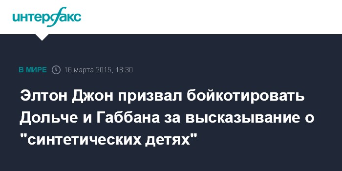 Москва. 16 марта. INTERFAX.RU - Известные модельеры Доменико Дольче и Стефано Габбана вызвали гнев общественности критикой однополых семей и заявлениями о "синтетических детях", сообщает The Guardian.