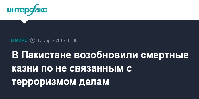 Как сообщалось, 10 марта власти Пакистана приняли решение полностью отменить мораторий на смертную казнь. Соответствующее распоряжение опубликовано МВД Пакистана. Ранее мораторий распространялся на всех приговоренных к смерти за исключением виновных в терроризме.
