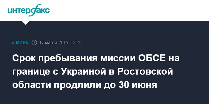 Москва. 17 марта. INTERFAX.RU - Срок пребывания членов миссии ОБСЕ в Ростовской области решено было продлить до 30 июня 2015 года, сообщил журналистам во вторник глава миссии ОБСЕ в Ростовской области Поль Пикар.