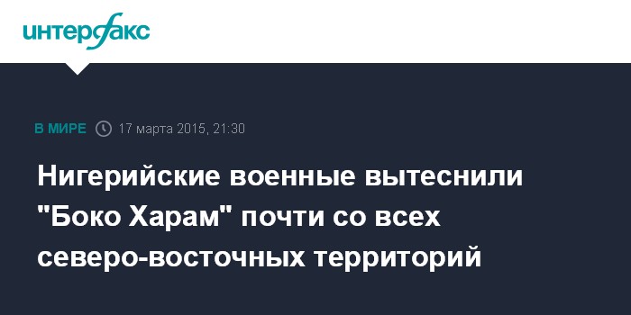 Москва. 17 марта. INTERFAX.RU – Правительственные войска Нигерии вытеснили боевиков из группировки "Боко Харам" практически со всех территорий на северо-востоке страны, пишет газета Le Figaro со ссылкой на нигерийские власти.