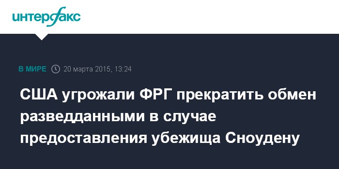 Москва. 20 марта. INTERFAX.RU - США предупредили ФРГ, что прекратят поставлять ей данные американской разведки в случае, если Берлин решится предоставить бывшему сотруднику Агентства национальной безопасности (АНБ) Эдварду Сноудену убежище или разрешит ему поездку в страну, сообщил вице-канцлер и министр экономики ФРГ Зигмар Габриэль.