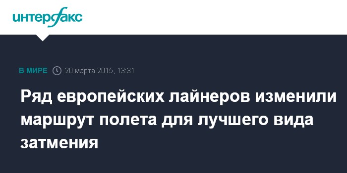 Москва. 20 марта. INTERFAX.RU - Несколько пассажирских авиалайнеров в Европе слегка отклонились от маршрутов полета, чтобы дать возможность пассажирам получше рассмотреть солнечное затмение, сообщает сайт Flightradar 24, отслеживающий передвижения самолетов.