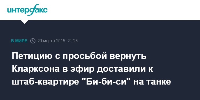 Москва. 20 марта. INTERFAX.RU - К зданию "Би-би-си" на танке доставили петицию с просьбой вернуть Джереми Кларксона в эфир популярного автошоу Top Gear, которую подписали почти миллион человек. Об этом сообщают британские СМИ.