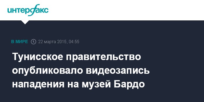 Москва. 22 марта. INTERFAX.RU - Правительство Туниса опубликовало видеозапись нападения террористов на музей Бардо, унесшее жизни 25 человек, сообщила в воскресенье BBC News.