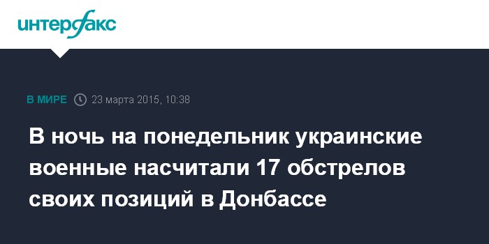 Москва. 23 марта. INTERFAX.RU - В ночь на понедельник зафиксировано 17 обстрелов позиций украинских военных со стороны ополченцев, сообщили в пресс-центре спецоперации.