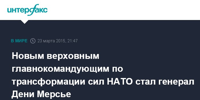 Москва. 23 марта. INTERFAX.RU - Генерал ВВС Франции Дени Мерсье назначен на должность верховного главнокомандующего по трансформации объединенных вооруженных сил Североатлантического альянса, сообщается в коммюнике НАТО.
