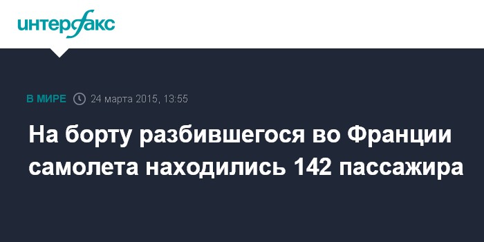 Москва. 24 марта. INTERFAX.RU - На борту разбившегося во Франции пассажирского самолета A320 находились 142 пассажира, сообщает радиостанция Europe-1.