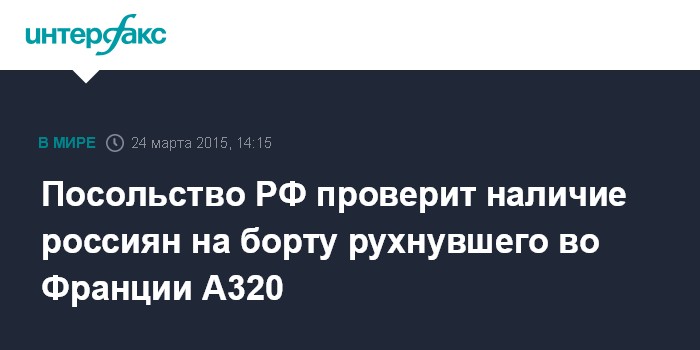 Москва. 24 марта. INTERFAX.RU - Российские дипломаты в Германии уточняют информацию о возможном наличии граждан РФ на борту разбившегося во вторник на юго-востоке Франции пассажирского самолета А320, следовавшего из Барселоны в Дюссельдорф.