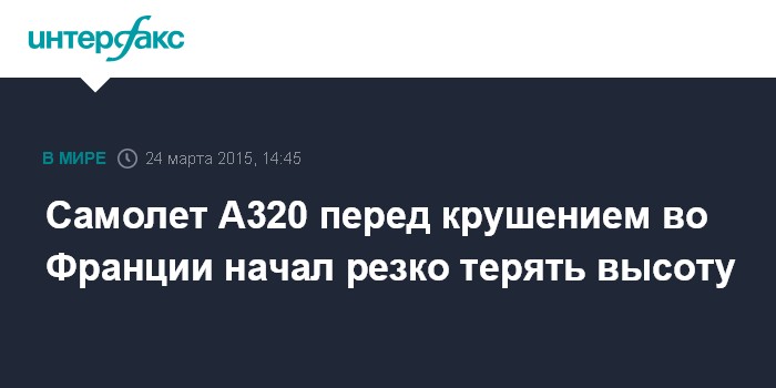 Москва. 24 марта. INTERFAX.RU - Разбившийся на юге Франции самолет авиакомпании Germanwings перед катастрофой на протяжении довольно длительного периода терял высоту, сообщает французский телеканал TF1 со ссылкой на местных экспертов.