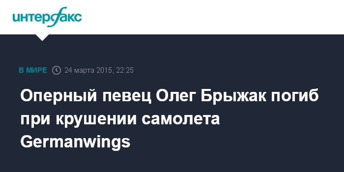 Москва. 24 марта. INTERFAX.RU - Известный оперный певец Олег Брыжак, начавший карьеру в 80-х годах прошлого века в СССР, был среди пассажиров разбившегося на юге Франции самолета А320 авиакомпании Germanwings, сообщает во вторник немецкая газета Bild.