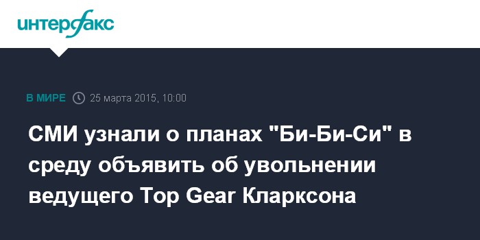 Москва. 25 марта. INTERFAX.RU - Руководство "Би-Би-Си" в среду, вероятно, объявит об увольнении оказавшегося в центре скандала популярного телеведущего программы об автомобилях Top Gear Джереми Кларксона, сообщает британская газета The Daily Telegraph.
