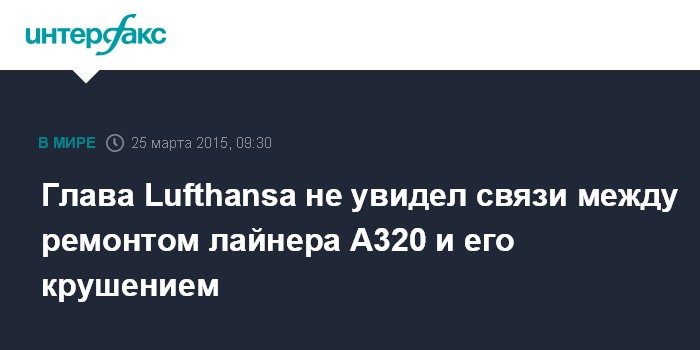 Москва. 25 марта. INTERFAX.RU - Глава авиакомпании Deutsche Lufthansa AG Карстен Шпор заявил, что ремонт самолета Airbus А320 авиакомпании Germanwings ("дочка" Lufthansa) в аэропорту Дюссельдорфа не мог быть причиной крушения лайнера на юге Франции.