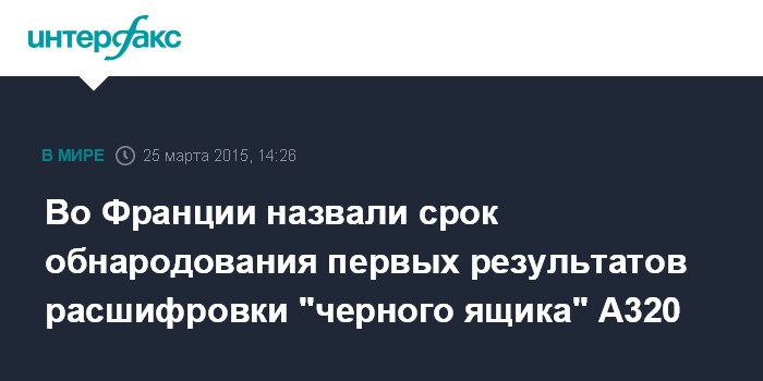 Москва. 25 марта. INTERFAX.RU - Французские власти надеются, что первые результаты расшифровки бортового самописца самолета А320 станут известны в течение среды, 25 марта, заявил прокурор Марселя Брис Робен.