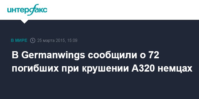 Москва. 25 марта. INTERFAX.RU - В результате авиакатастрофы на юге Франции, по предварительной информации, погибли 72 немца, 35 испанцев и два американца, сообщили в среду в компании Germanwings.