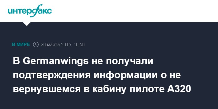 Москва. 26 марта. INTERFAX.RU - В авиакомпании Germanwings не смогли подтвердить или опровергнуть сообщения СМИ о том, что один из пилотов авиалайнера A320, потерпевшего крушение во французских Альпах, перед аварией покинул кабину и не смог вернуться.