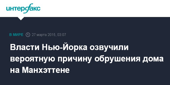 Москва. 27 марта. INTERFAX.RU - Мэр Нью-Йорка заявил, что причиной взрыва и последовавшего за ним пожара в жилом пятиэтажном доме на Манхэттене стала утечка бытового газа.
