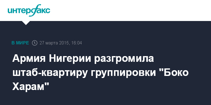 Москва. 27 марта. INTERFAX.RU - Нигерийская армия освободила от исламистов город Гуоза на севере страны и уничтожила штаб-квартиру радикальной группировки "Боко Харам", сообщили в пятницу в Минобороны Нигерии.
