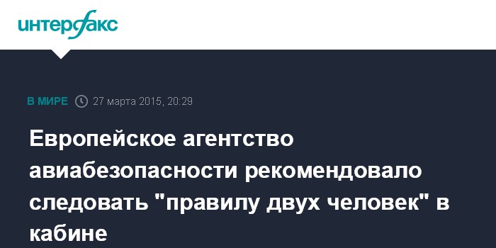 "EASA публикует сегодня временные рекомендации для авиакомпаний, направленные на обеспечение того, чтобы по меньшей мере два члена экипажа, в том числе как минимум один квалифицированный пилот находились в пилотской кабине в течение всего времени полета", - говорится в коммюнике агентства.