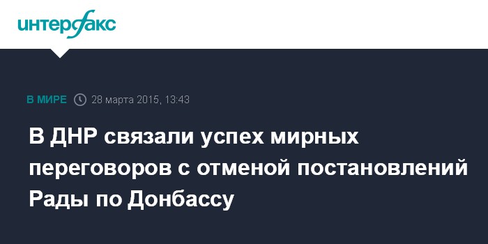 Москва. 28 марта. INTERFAX.RU - Успех дальнейших мирных переговоров по урегулированию на востоке Украины напрямую зависит от того, отменит ли Киев принятые Верховной радой 17 марта поправки к закону об особом статусе Донбасса, считают в ДНР.