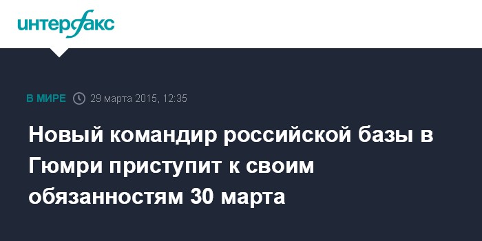 Москва. 29 марта. INTERFAX.RU - В понедельник к исполнению своих обязанностей на 102-й российской базе, дислоцированной в Гюмри, приступит новый командир, сообщил первый замглавы комитета Госдумы по делам СНГ Олег Лебедев.