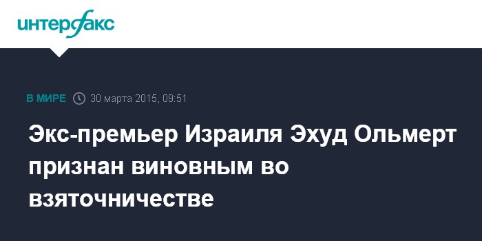 Москва. 30 марта. INTERFAX.RU - Бывший глава правительства Израиля Эхуд Ольмерт признан виновным в мошенничестве и злоупотреблении общественным доверием в ходе судебного пересмотра дела, передает в понедельник агентство Associated Press.