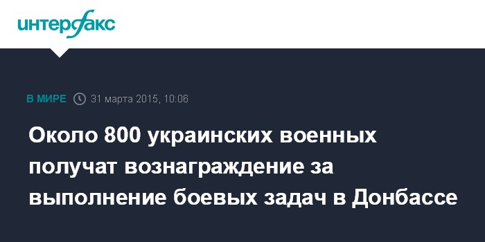 Москва. 31 марта. INTERFAX.RU - По состоянию на вторник украинским военнослужащим выплачено более 1 млн гривен вознаграждения за выполнение боевых задач, уничтожение и захват техники противника, сообщили в Генштабе Вооруженных сил Украины. В ближайшее время вознаграждение получат около 800 военнослужащих.
