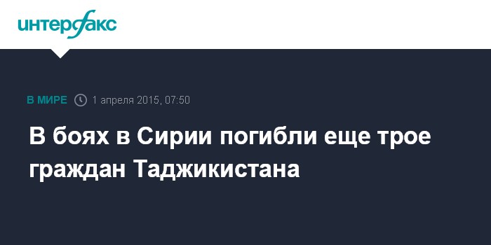 Москва. 1 апреля. INTERFAX.RU - В боях в Сирии и Ираке за так называемое "Исламское государство" погибли еще не менее трех граждан Таджикистана, сообщили в среду таджикские независимые СМИ со ссылкой на родственников погибших.