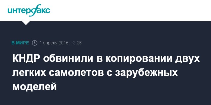 Москва. 1 апреля. INTERFAX.RU - Не менее двух произведенных в КНДР легких самолетов скопированы с иностранных моделей, сообщает в среду веб-сайт NK news со ссылкой на своих экспертов-аналитиков.