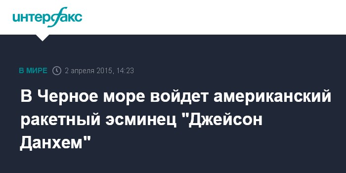 Москва. 2 апреля. INTERFAX.RU - Эскадренный миноносец управляемого ракетного оружия УРО DDG 109 "Джейсон Данхем" войдет в пятницу в акваторию Черного моря, сообщили в четверг "Интерфаксу" в Главном штабе ВМФ России.
