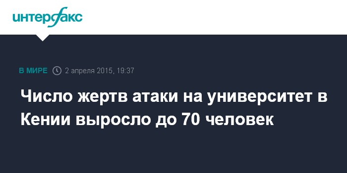 Москва. 2 апреля. INTERFAX.RU - До 70 человек увеличилось число погибших в результате нападения боевиков на университет в кенийском городе Гарисса, сообщает в четверг Washington Post.