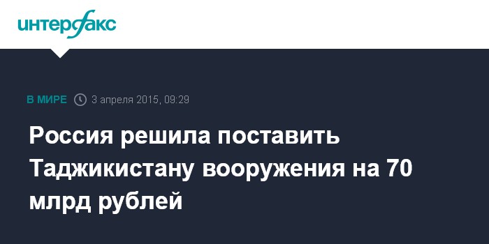 Москва. 3 апреля. INTERFAX.RU - Россия готова в ближайшие годы готова предоставить Таджикистану военно-техническую помощь в размере около 70 млрд рублей (около $1,23 млрд), сообщает "Коммерсант" в пятницу со ссылкой на источники в российском Генштабе.