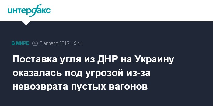 Москва. 3 апреля. INTERFAX.RU - ДНР начала экспорт угля на Украину после установления контроля над Дебальцевским железнодорожным узлом, сообщил в пятницу руководитель администрации главы самопровозглашенной республики Максим Лещенко. Однако дальнейшие поставки украинским потребителям находятся под угрозой, поскольку в ДНР не возвращаются пустые вагоны.