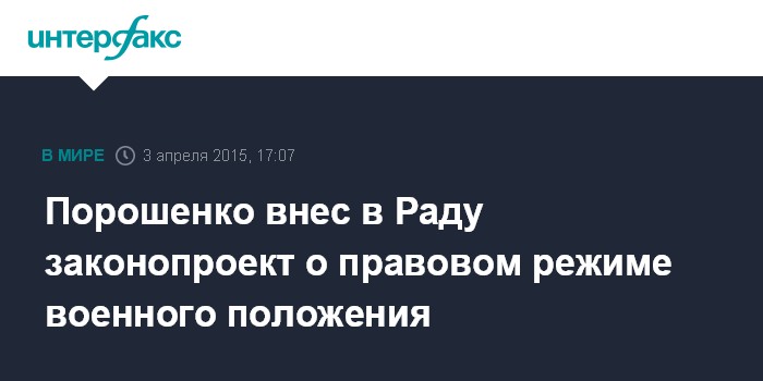 Москва. 3 апреля. INTERFAX.RU - Президент Украины Петр Порошенко внес в Верховную раду проект закона о правовом режиме военного положения.