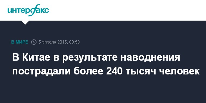 Москва. 5 апреля. INTERFAX.RU - Более 240 тыс. человек пострадали от наводнения в провинции Хунань в центральной части Китая, сообщают местные СМИ. Причиной бедствия стали непрекращающиеся дожди. В результате уровень воды в озере Дунтинху поднялся до отметки в 24 метра.