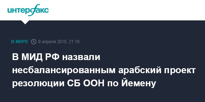Москва. 6 апреля. INTERFAX.RU - Российская сторона считает несбалансированным проект резолюции СБ ООН по Йемену, представленный странами Персидского залива, и не предвидит в ближайшем будущем голосования по тексту.