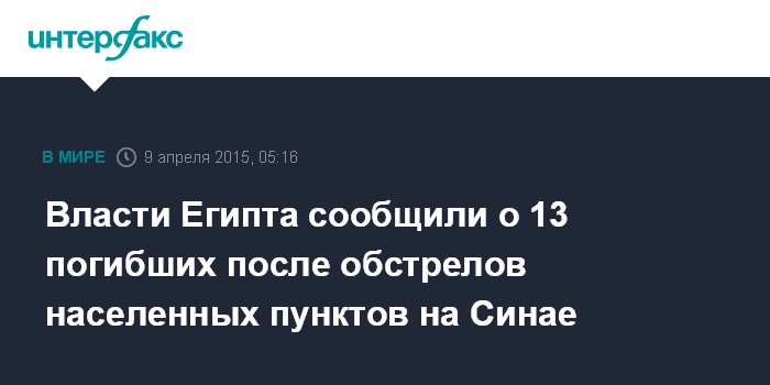 Москва. 9 апреля. INTERFAX.RU - Не менее 13 человек стали жертвами минометного и ракетного обстрела двух населенных пунктов на Синайском полуострове в Египте в среду, сообщили местные власти.