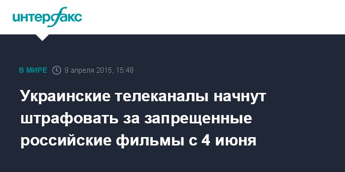 Москва. 9 апреля. INTERFAX.RU - С 4 июня к телеканалам, демонстрирующим в украинском эфире фильмы и сериалы российского производства, подпадающие под действие закона "О внесении изменений в некоторые законы о защите информационного телерадиопространства Украины", будут применяться штрафные санкции, сообщил глава Национального совета по вопросам телевидения и радиовещания Юрий Артеменко на брифинге в четверг.