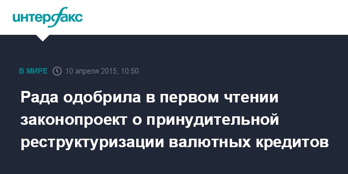 Москва. 10 апреля. INTERFAX.RU - Верховная рада Украины одобрила в первом чтении законопроект о принудительной реструктуризации валютных кредитов, что не соответствует меморандуму с Международным валютным фондом (МВФ).