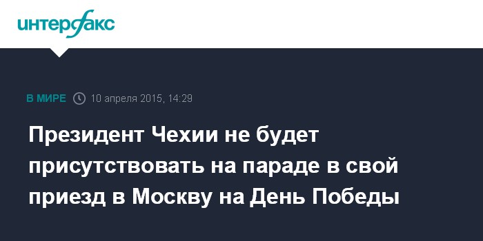 Москва. 10 апреля. INTERFAX.RU - Президент Чехии Милош Земан решил не отказываться от визита в Россию на празднование 70-й годовщины Победы, однако он не будет присутствовать на параде 9 мая, сообщает в пятницу агентство Associated Press.
