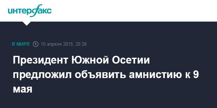 Москва. 10 апреля. INTERFAX.RU - Президент Южной Осетии Леонид Тибилов предложил парламенту республики рассмотреть вопрос об амнистии к 9 мая в связи с 70-летием Победы в Великой Отечественной войне, сообщила "Интерфаксу" в пятницу пресс-секретарь президента Гана Яновская.