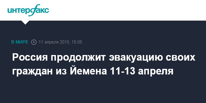 Москва. 11 апреля. INTERFAX.RU - Эвакуация российских граждан из Йемена намечена на 11-13 апреля, их родственники могут уточнить информацию о прибытии в ситуационно-кризисном центре МИД России.