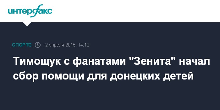 Москва. 12 апреля. INTERFAX.RU - Капитан "Зенита" Анатолий Тимощук совместно с фанатами петербургского футбольного клуба начал сбор помощи для детей из детдомов Донецка.