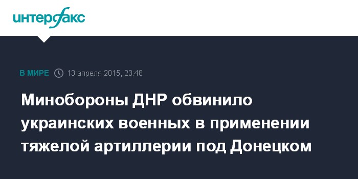 Москва. 13 апреля. INTERFAX.RU - В Минобороны самопровозглашенной Донецкой Народной Республики обвиняют украинских военных в применении тяжелой артиллерии под Донецком, сообщает в понедельник Донецкое агентство новостей
