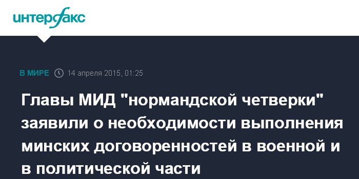 Москва. 14 апреля. INTERFAX.RU - Главы МИД "нормандской четверки" подчеркнули необходимость выполнения минских договоренностей в полном объеме, заявил во вторник глава МИД РФ Сергей Лавров.