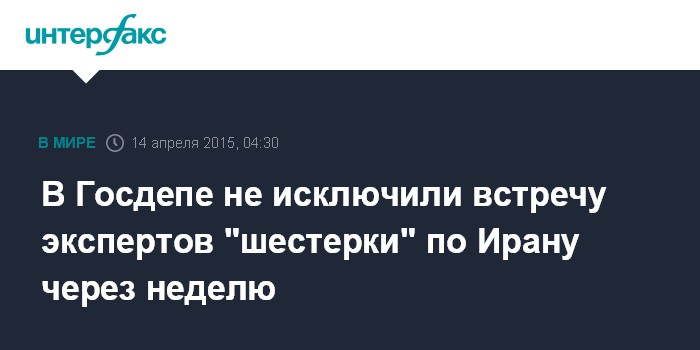 Москва. 14 апреля. INTERFAX.RU - Как ожидается, эксперты "шестерки" переговорщиков по иранской ядерной программе (ИЯП) и иранские представители встретятся на будущей неделе для обсуждения деталей договоренностей, достигнутых 2 апреля в Лозанне, сообщила представитель госдепартамента США Мари Харф.