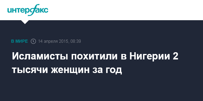 Москва. 14 апреля. INTERFAX.RU - С начала 2014 года исламистская группировка "Боко харам" похитила в Нигерии не менее 2 тыс. женщин и девочек, сообщила во вторник правозащитная организация Аmnesty International.