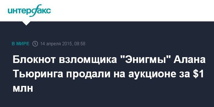 Москва. 14 апреля. INTERFAX.RU - Блокнот, принадлежавший британскому специалисту по дешифровке и пионеру компьютерной техники Алану Тьюрингу, продан за $1,025 млн на аукционе в Нью-Йорке.